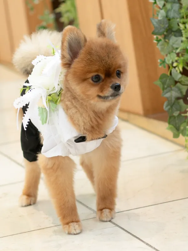 新郎新婦とペットとのご家族写真は、感動的な瞬間となること間違いなしです。 当店ではわんちゃんとフォトウェディング撮影できる専用プランもご用意。 リボンやお花をまとったわんちゃんがリングを運ぶなどとってもキュート♡
